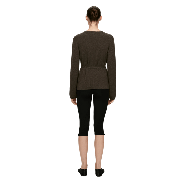 Crafted from a soft cashmere blend with a touch of wool for enhanced durability, this fine-knit cardigan exudes both elegance and comfort. The wrap style, complete with waist-tying straps, creates a flattering silhouette while offering versatility for layering.
