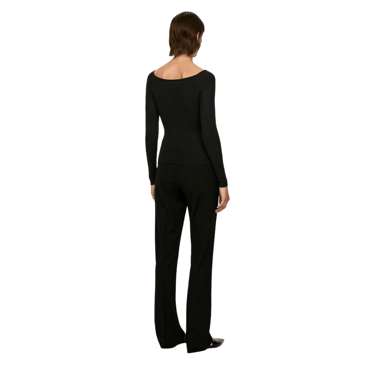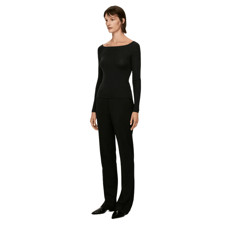 Beautifully crafted from a premium wool blend, this rib-knit top exudes effortless sophistication. Its flattering off-shoulder design is accentuated by delicate ribbed binding at the neckline, adding a touch of subtle detail.
