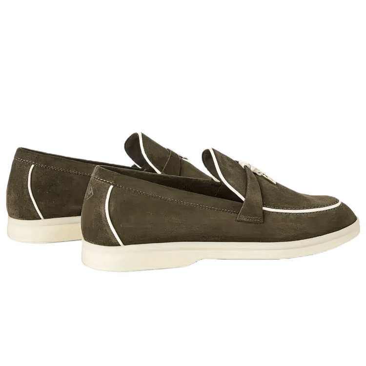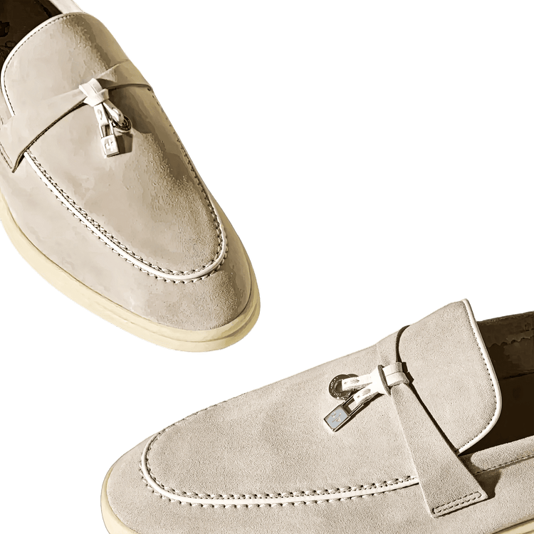 These elegant loafers feature soft nappa leather piping and are adorned with charming suede saddles, highlighted by Loro Piana My Charms.